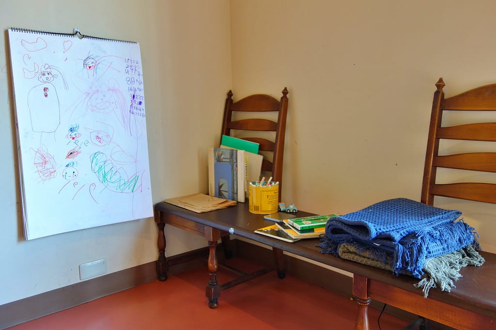 子どもがお絵描きできるスペースもあります。待ち時間も退屈せずにすみますね。