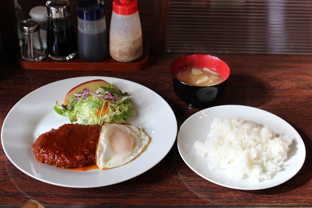 ご飯と味噌汁、そしてダブルスカロップの3点がセットになっています。ダブルスカロップの隣には目玉焼き、そしてサラダも。ちなみに、使用している米と野菜は矢吹町産です。