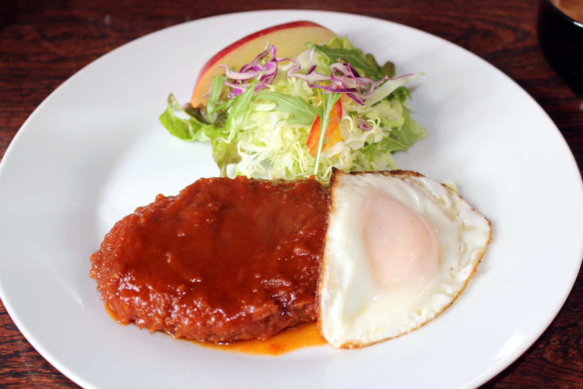 ご飯と味噌汁、そしてダブルスカロップの3点がセットになっています。ダブルスカロップの隣には目玉焼き、そしてサラダも。ちなみに、使用している米と野菜は矢吹町産です。