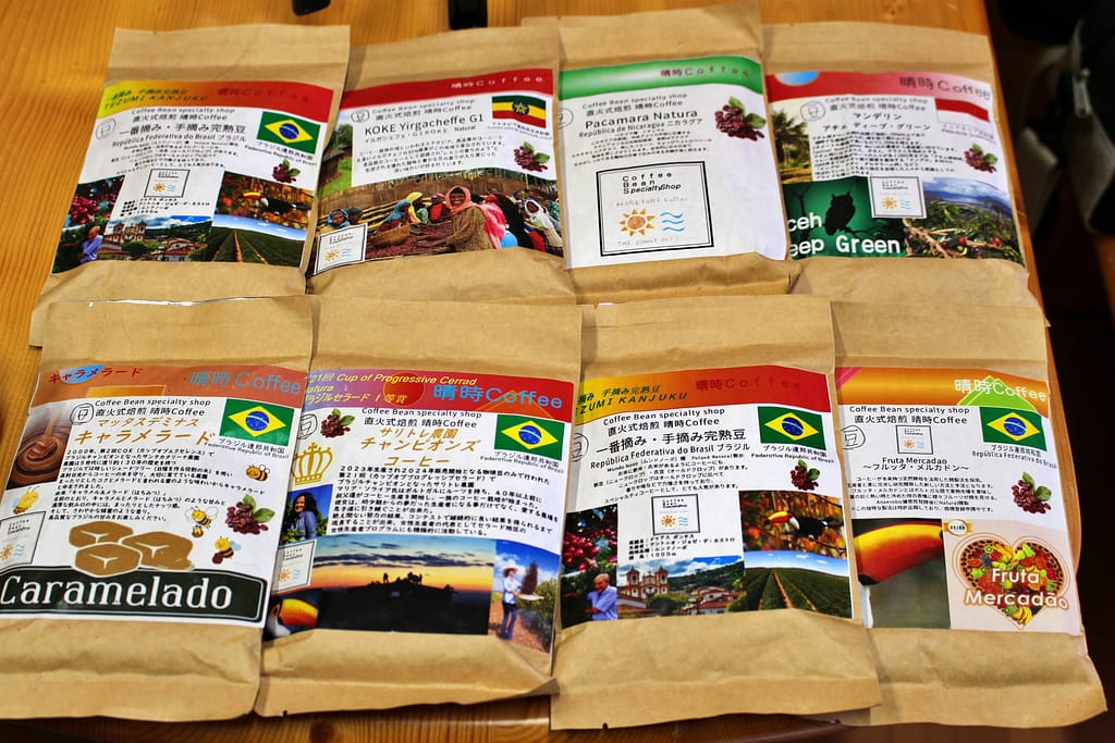 上の写真はお店で取り扱っている一番摘み・手摘み完熟豆です。コーヒーの収穫は専用の機械で行われることが少なくないのですが、こちらは人の目で完熟したものだけを選んで収穫しています。大きさや色が均一で、見た目もきれいですね。