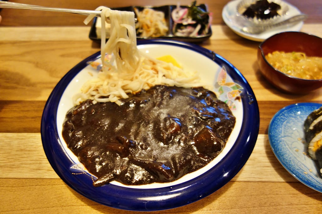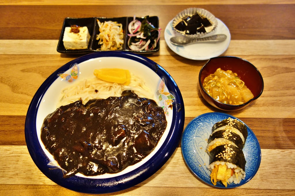 韓国の黒味噌の一種「チュンジャン」をベースとしたソースで肉やたまねぎ、じゃがいもといった具材を炒め、茹でた麺にたっぷりとかけた一品です。