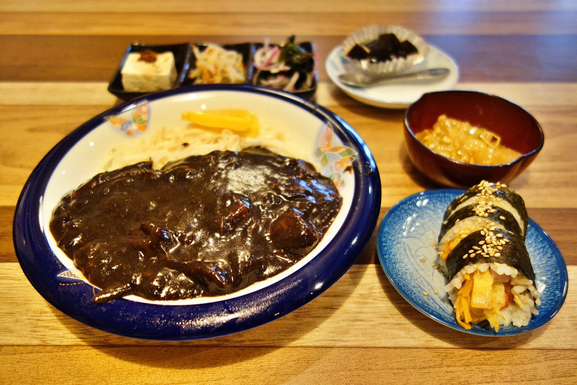 今回注文したのはジャジャン麺(税込880円)。ミニのりまき、小鉢、デザートもセットになっています。
