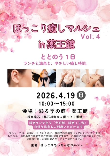 4月19日(日)に開催される「第3回ほっこり癒しマルシェ」は石川町の旅館、薬王館が会場となります。限定ランチと温泉つきで、さらにゆったりと過ごせるひとときになりそうです。