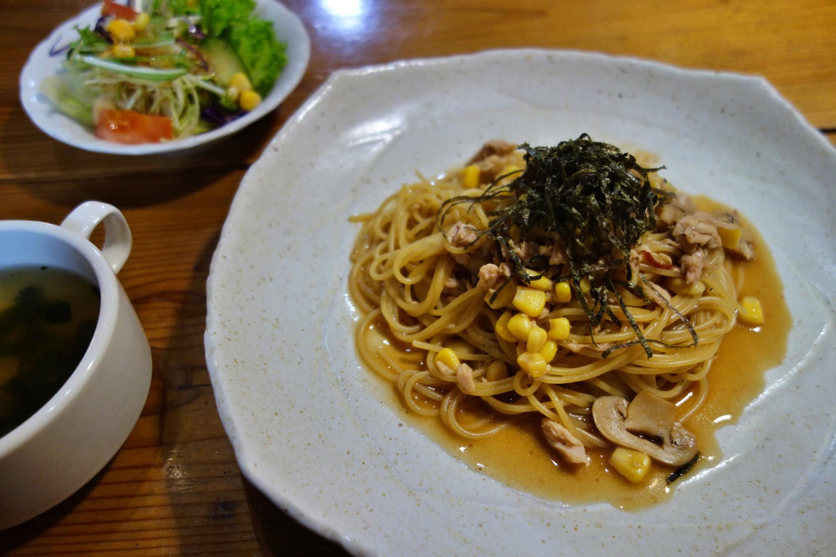 今回はランチメニューのツナの和風スパゲッティー(税込950円)にサラダ(+税込150円)を追加で注文しました。写真には写っていませんが、セットでドリンクもつきます。