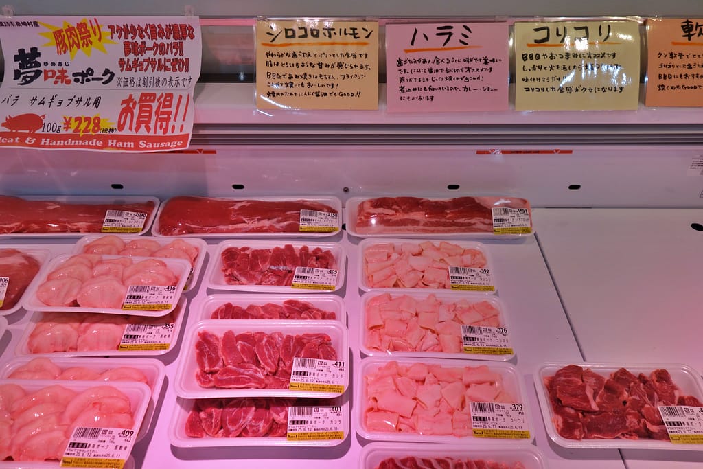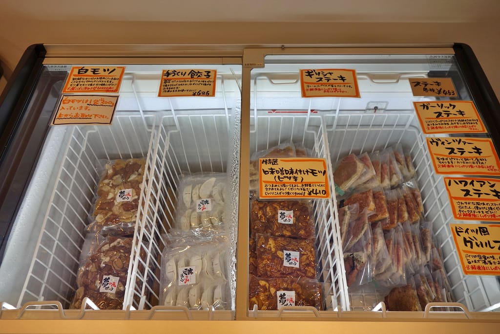 こちらは冷凍コーナー。モツや餃子、さまざまな風味に味付けされたステーキ肉がずらりと並んでいます。