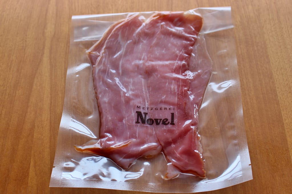 一般的な生ハムよりもジューシーなことにまず驚き。厚めにスライスされており、肉の繊維に沿ってほぐれます。