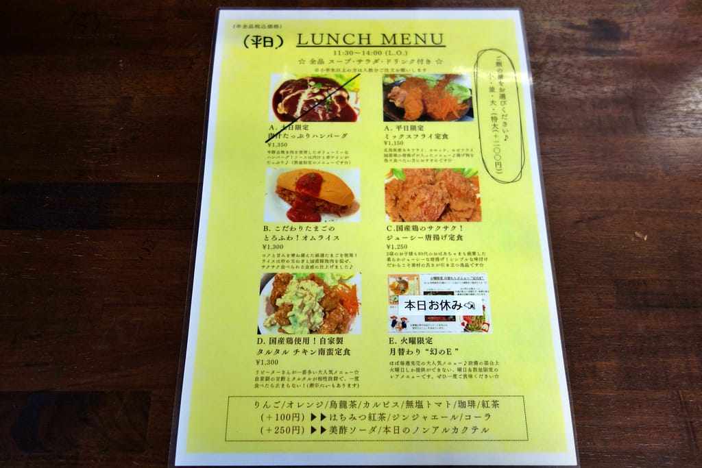 ランチメニューには唐揚げやチキン南蛮、オムライスなどが並んでいます。どれも魅力的で目移りしてしまいます。