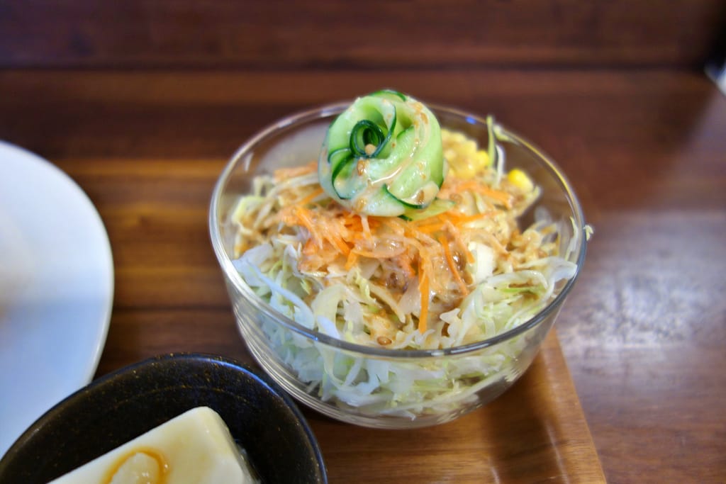 サラダの上には、かわいらしい花の形をしたきゅうりが載っています。ごまドレッシングでおいしくいただきました。