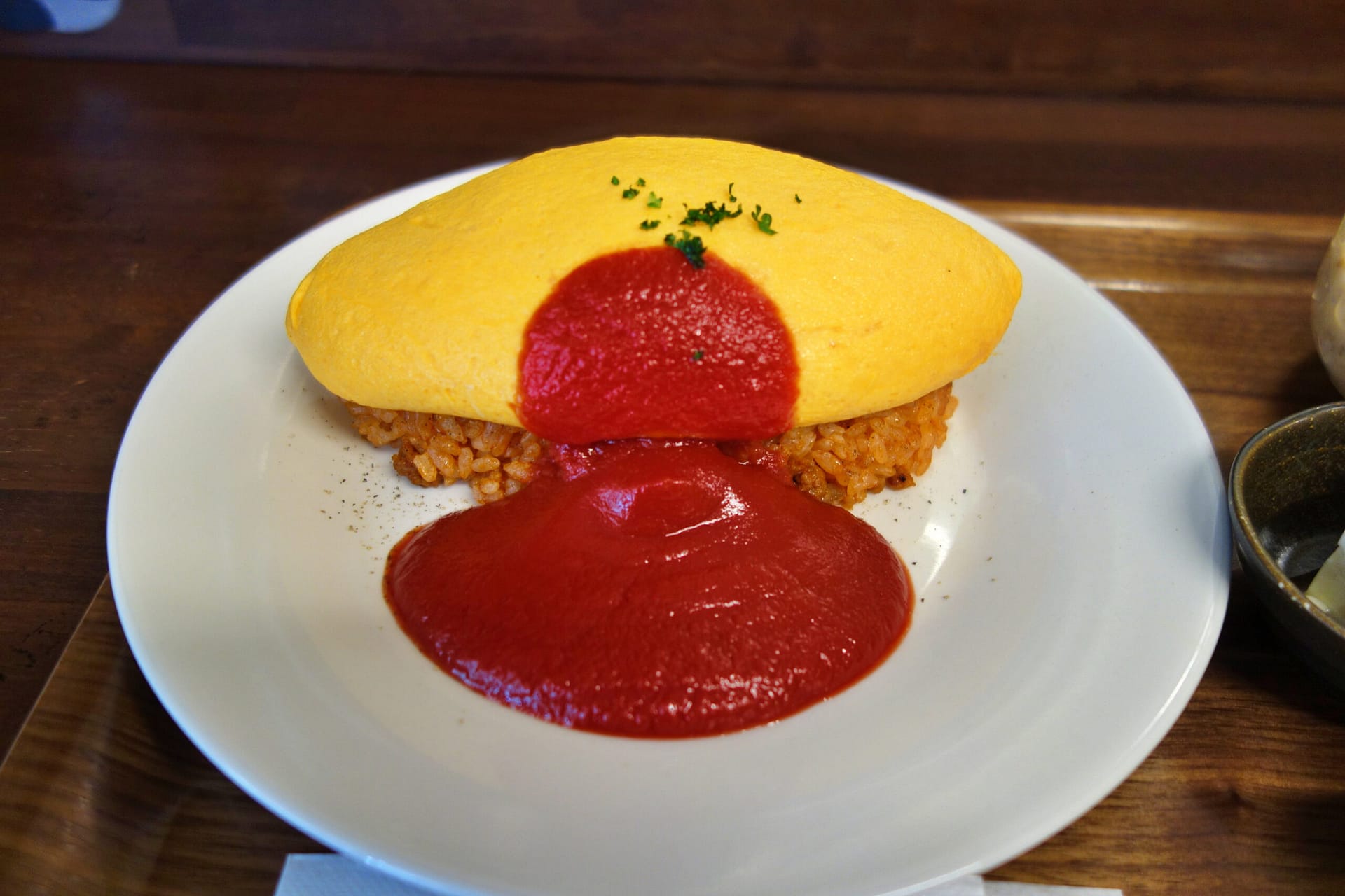 オムライスは、ラグビーボール型の卵がご飯に載っています。シワ一つない見事な仕上がりなのはさすがプロの仕事。黄色い卵と赤いケチャップソースとのコントラストが食欲をそそります。