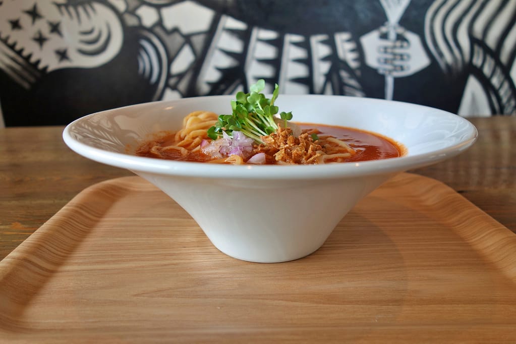 すると、小さなスプーン1杯分を入れただけで、カレーラーメンのような味にがらりと変わったのです。トマト鶏白湯スープとの相性もばっちりで、また違ったおいしさを楽しめました。