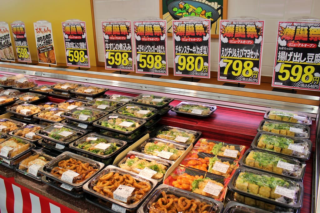 こちらは総菜コーナーです。大きなお惣菜がずらりと並んでおり迫力があります。