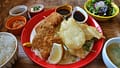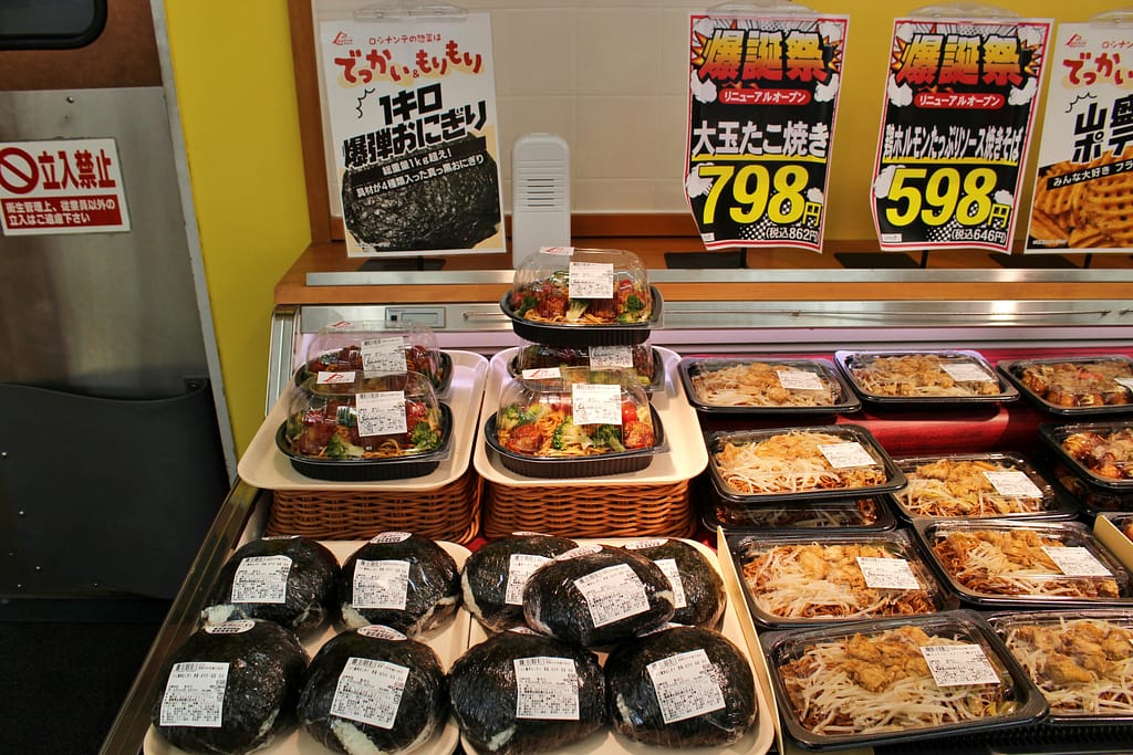 写真左下部の黒くて丸いものは、なんと総重量1kg超えの巨大なおにぎりです。1つのおにぎりの中に唐揚げ、おかか、高菜、昆布の4種類のおかずが入っています。