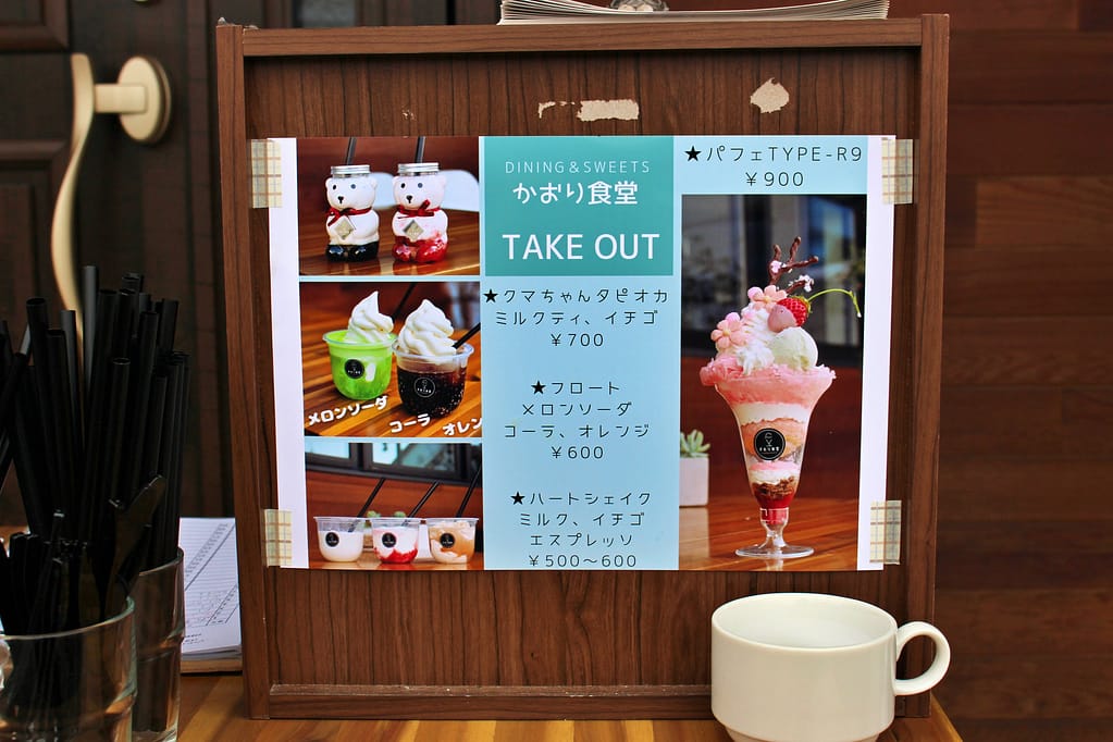 受付カウンターでは、テイクアウトメニューのラインナップが写真付きで紹介されています。パフェをはじめ、どれもおいしそうです。