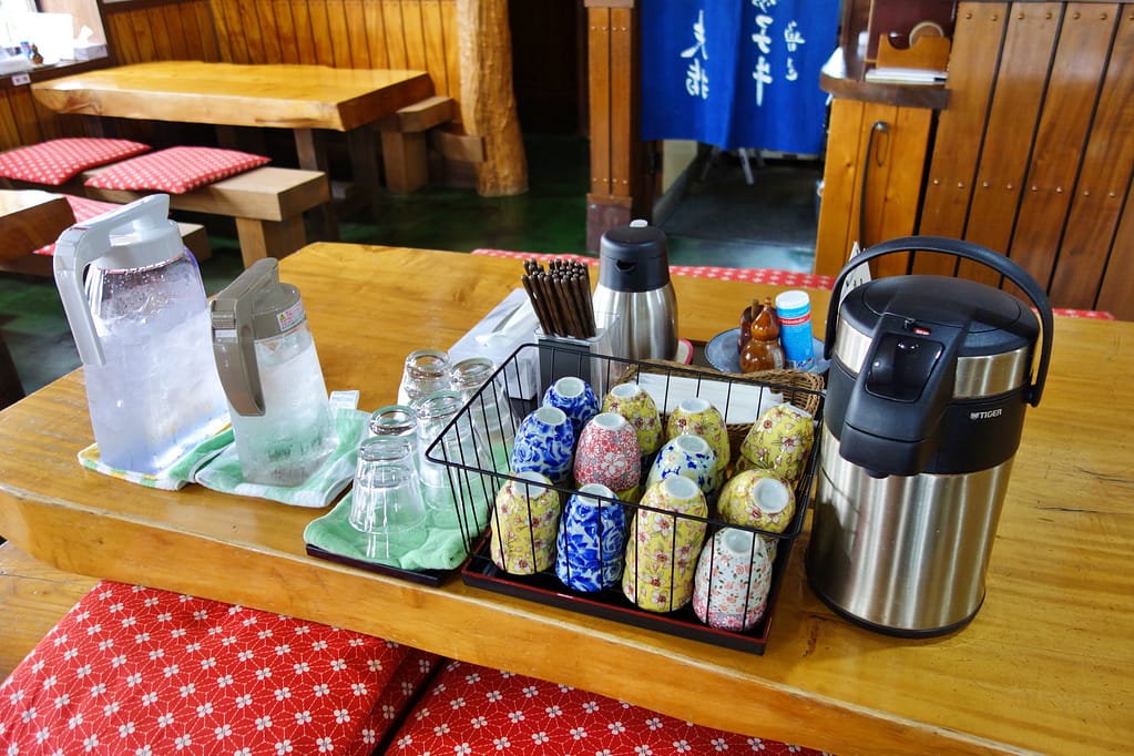 飲み物とおしぼりはセルフサービス。飲み物は、お冷と温かいお茶が用意されています。