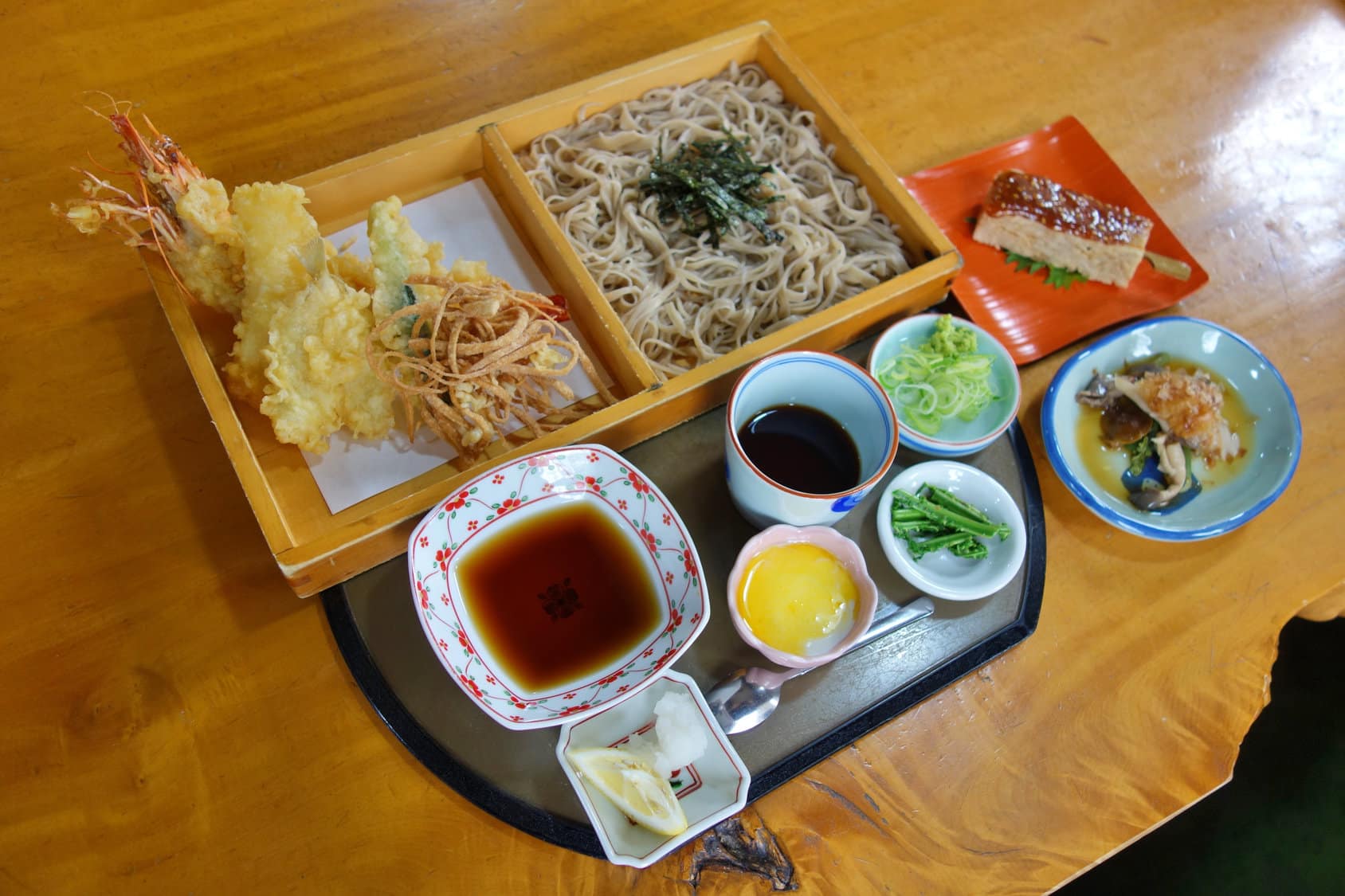 ざるそばに天ぷら、山菜、そば田楽、そしてデザートのヨーグルトまでついている豪華なセットです。