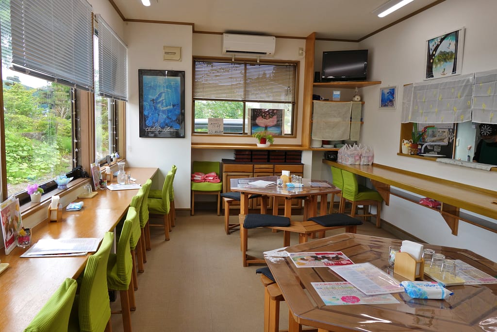 店内はアットホームで賑やかな雰囲気です。テーブル席は広々としており、ゆったり座れます。