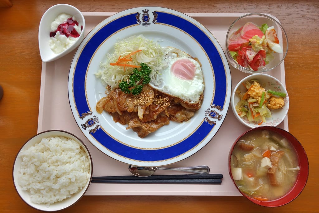 ヤキニクは、豚肉と玉ねぎが醤油ベースのタレで味付けされています。生姜が効いた濃いめの味で、ごはんとの相性は抜群です。