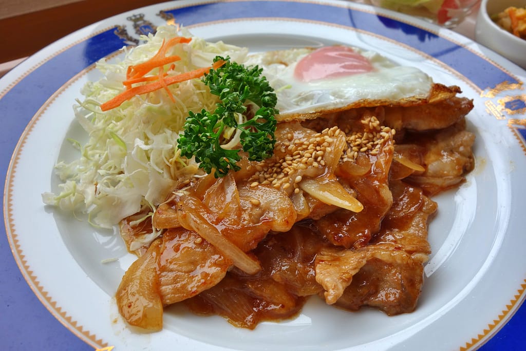 隣に添えられた目玉焼きの黄身を崩して肉に絡めると、味がまろやかに。千切りキャベツと一緒に食べると、さっぱりとした後味に。