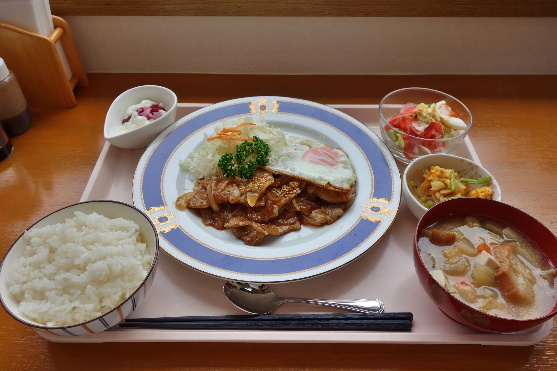 メインのヤキニクに加え、ごはんと味噌汁、小鉢、サラダ、そしてデザートのヨーグルトまでついています。さらに、ごはんと味噌汁はおかわり自由です。