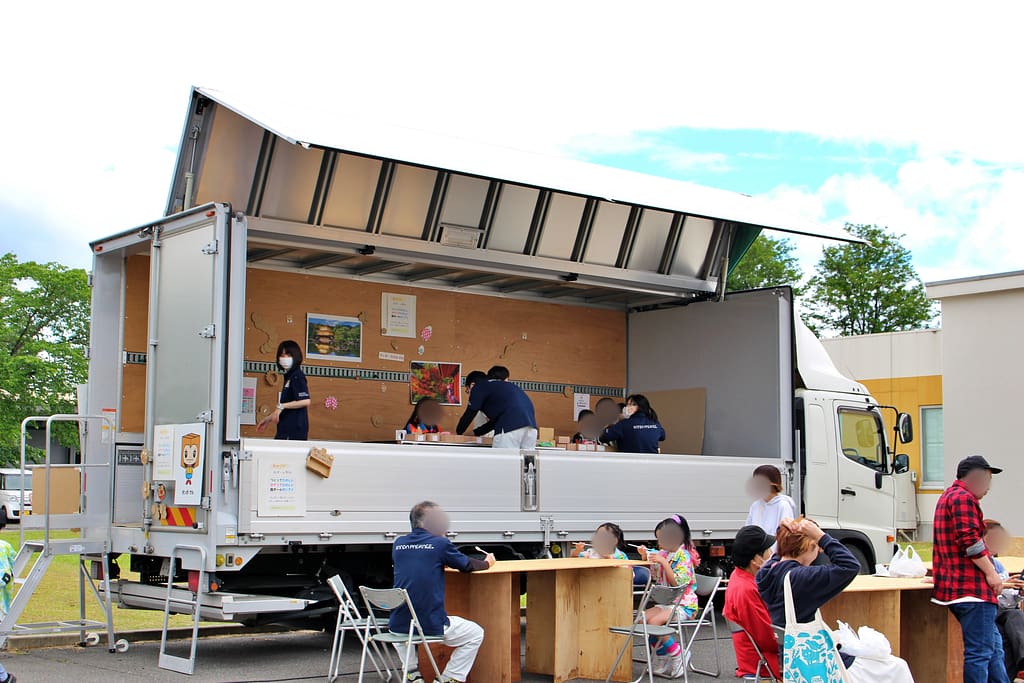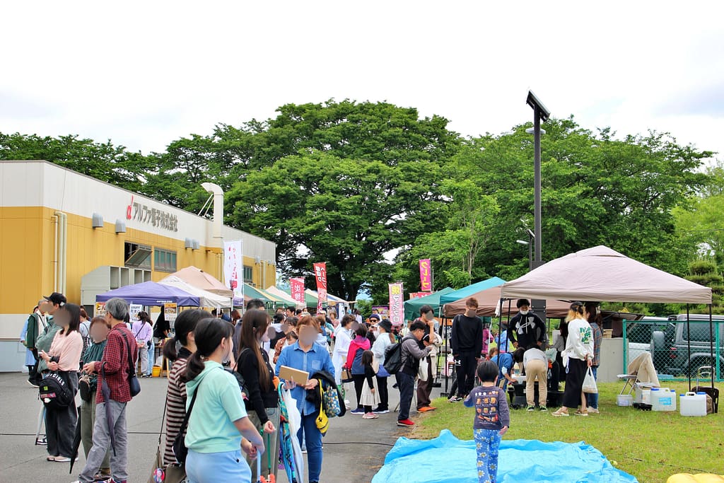 会場はアルファ電子株式会社。本社の前には出店のテントがずらりと並び、多くの人でにぎわっています。軽食を購入するご夫婦や、アトラクションを楽しむ子どもたちの姿などが見られ、楽しげな雰囲気に包まれていました。