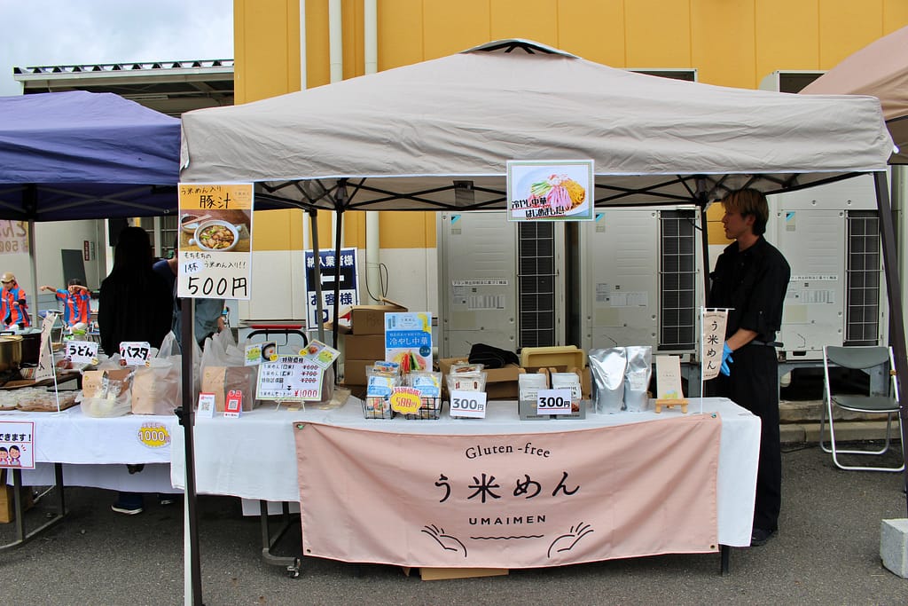 一見すると普通の豚汁ですが、実は中に「う米(まい)めん」が入っています。「う米めん」はグルテンフリーの米粉麺で、うどんのようにもっちりした食感が特徴。イベントを主催するアルファ電子が作っている人気商品です。