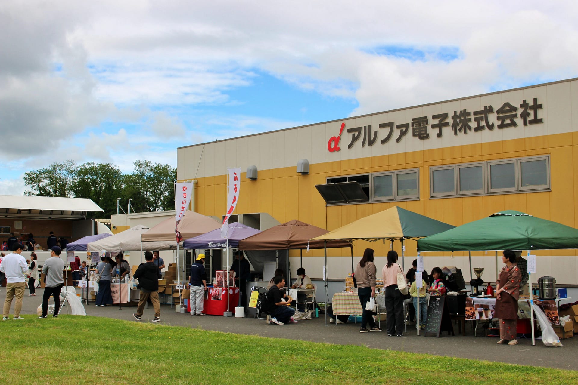 会場はアルファ電子株式会社。本社の前には出店のテントがずらりと並び、多くの人でにぎわっています。軽食を購入するご夫婦や、アトラクションを楽しむ子どもたちの姿などが見られ、楽しげな雰囲気に包まれていました。