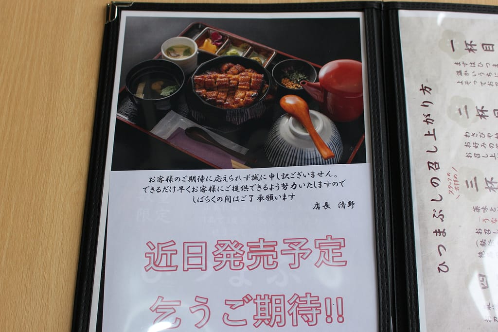 ページをめくるとひつまぶしの写真があります。こちらはゴールデンウィーク明けには販売を開始するとのこと。楽しみですね。
